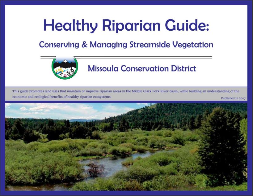 The Missoula Conservation District recently completed the Healthy Riparian Guide: Conserving & Managing Streamside Vegetation. While focused on the Middle Clark Fork River Basin, this document provides an overview of riparian areas (anything relating to the corridor along the banks of a stream, lake, or waterbody) applicable downstream in the Lower Clark Fork and all of Montana. The guide also includes some common issues in riparian areas, helpful tips about what not to do in a riparian area, practices that can improve riparian health, and other related information.