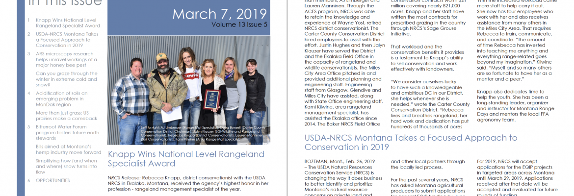 - And in other NRCS news, Montana is taking a “focused approach” to conservation initiatives. Each county will leverage local working groups to develop a focus for targeted EQIP projects. Conservation Districts can play a big role in this by helping the lead the local working groups.