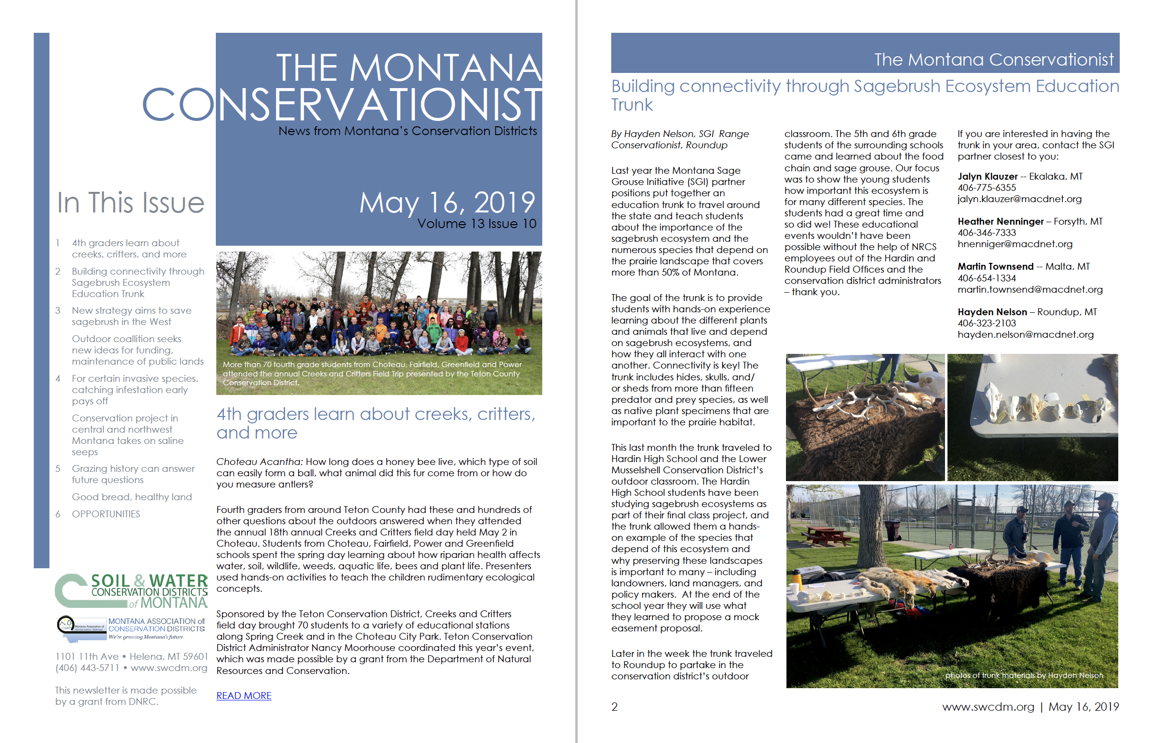 Welcome to the middle-of-May edition of The Montana Conservationist. We’ve got conservation news popping up faster than morel mushrooms after a fire. The stories this week: Springtime is the season when many districts host youth education events. The Choteau Acantha has a great write up about one of those, hosted for fourth graders in Choteau, […]